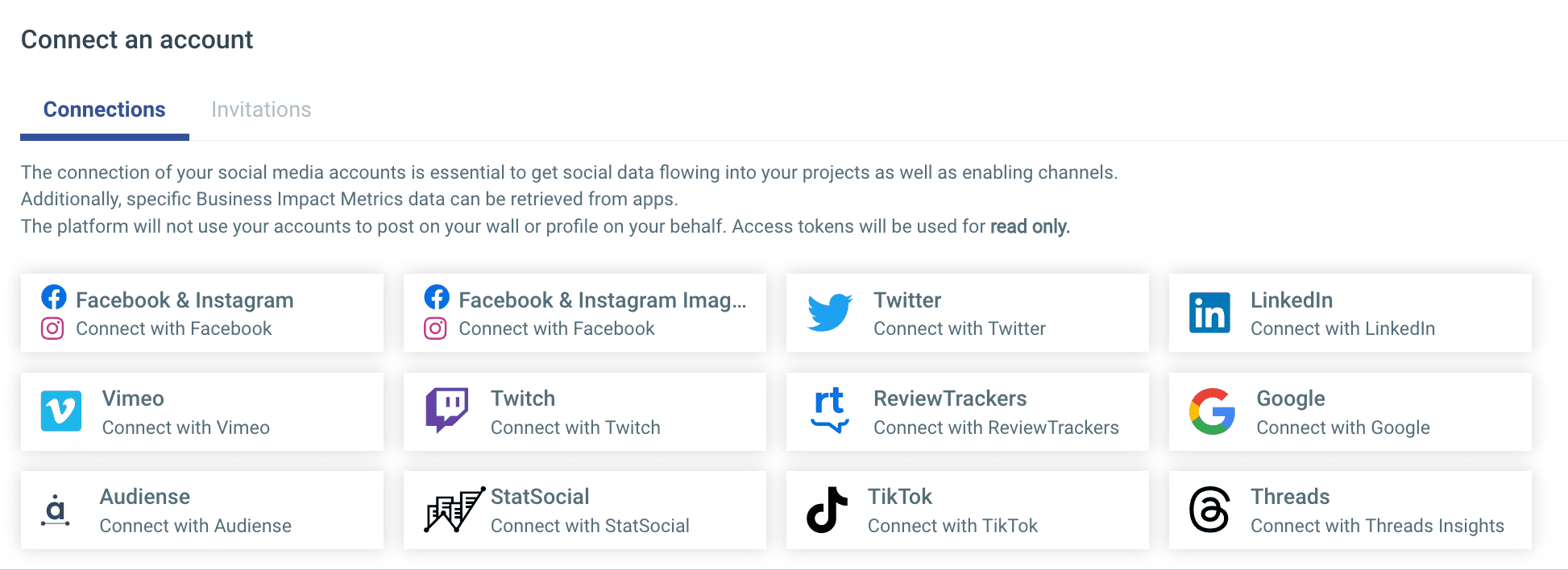 Open Project Settings for your new project, then click Connected Accounts. Click on the icon of a social network or other data source, then follow the prompts in the pop-up box to authorize Talkwalker to access your account.