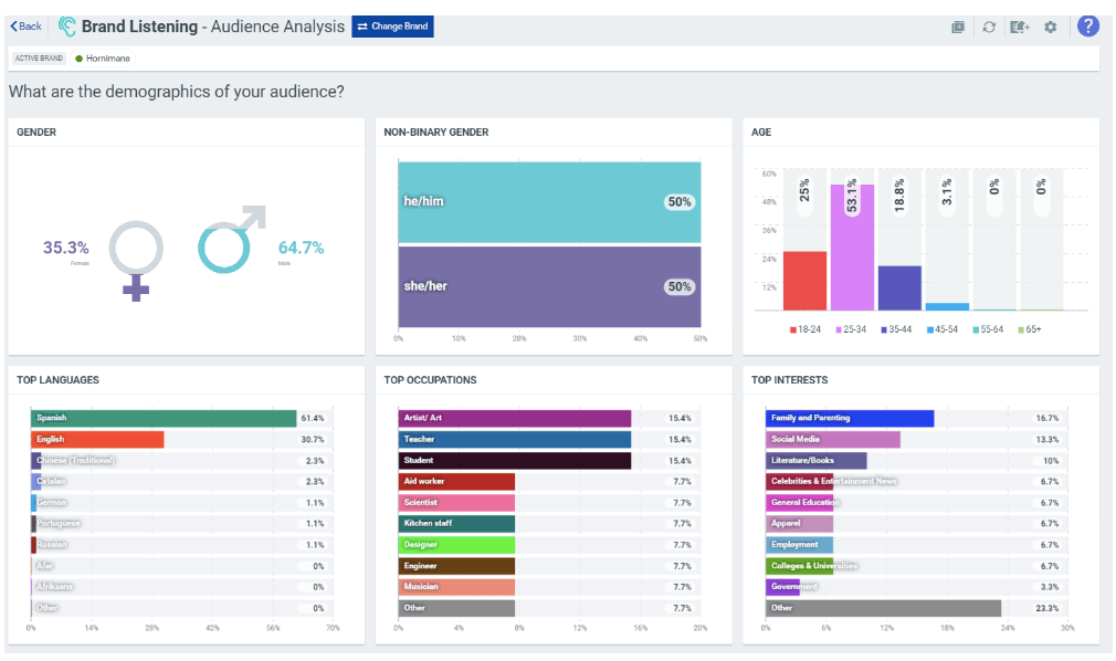 You’ll get a detailed look at your audience’s gender breakdown, age range, languages, and occupations. You’ll even get some basic psychographic information here with a look at their top interests (we’ll dive further into psychographics in a moment).
