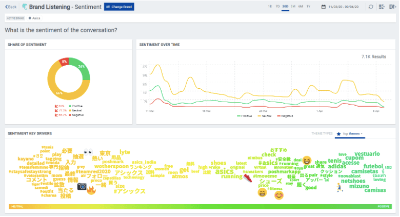 Within the Brand Listening IQ App, click the Sentiment tab in the left menu. You’ll get an overview of how people feel about your brand, as well as how those feelings have changed over time.