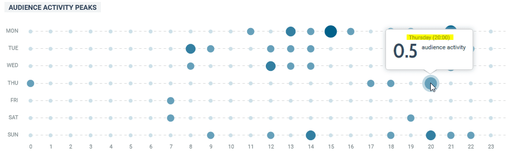 Look for the Audience Activity Peaks Widget, which is a heatmap of the days and times when your audience is most active online.