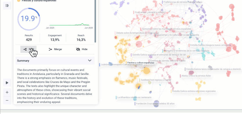 Use this AI-powered feature in Talkwalker to automatically group similar conversations based on shared interests and behaviors. You can click into each cluster and get an AI summary, so you don’t need to sort and define audience segments manually.