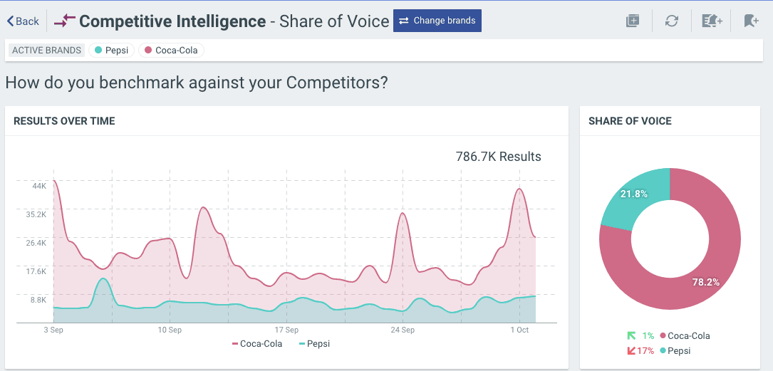 Talkwalker dashboard comparing Coca-Cola and Pepsi’s share of voice. Coca-Cola (pink) dominates with 78.2% vs Pepsi’s 21.8%. Line chart shows peaks through September; total results 786.7K. Visual benchmarks brand visibility over time—useful for tracking engagement spikes during fashion week or major campaigns.