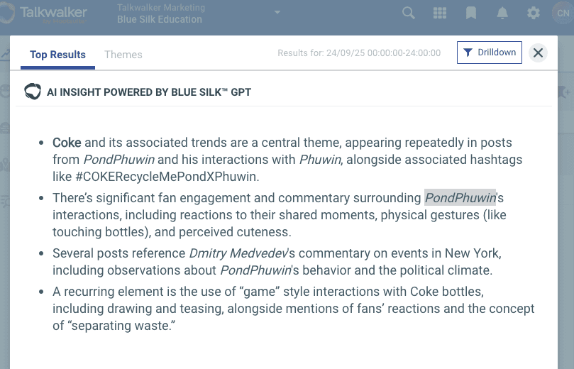 For example, the visualization in the chart above shows the results over time for the competitors Coke and Pepsi. But knowing where each brand had spikes in activity is only partly useful. Clicking on any spike or dip in the Talkwalker chart opens an AI-powered analysis of what was happening at that very moment.