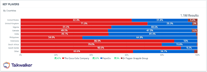 Understand brand perception as it compares to your competitors.Coca-Cola has the most share of voice in the industry, followed by Pepsi and Dr Pepper. Coca-Cola dominates Pepsi in the US and UK. The split was even in Nigeria, Canada and India, while Pepsi dominated the market in the Philippines.