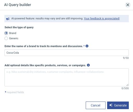 To narrow your results, you’ll use Boolean operators. You can build your query manually. Or you can use the AI Query builder in Talkwalker to build a precise query automatically.