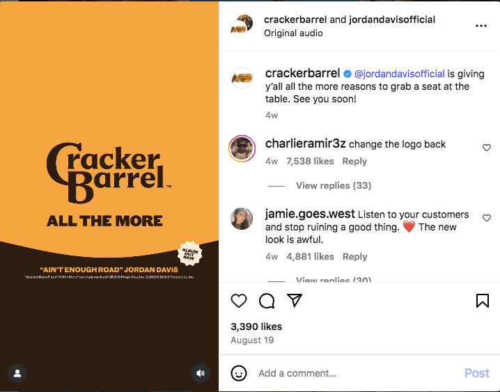 Customers were not happy. They saw the whole thing as taking the soul out of Cracker Barrel and making it another generic chain restaurant. The conversation on social media platforms was almost uniformly negative feedback, and the stock price dropped 7 percent.