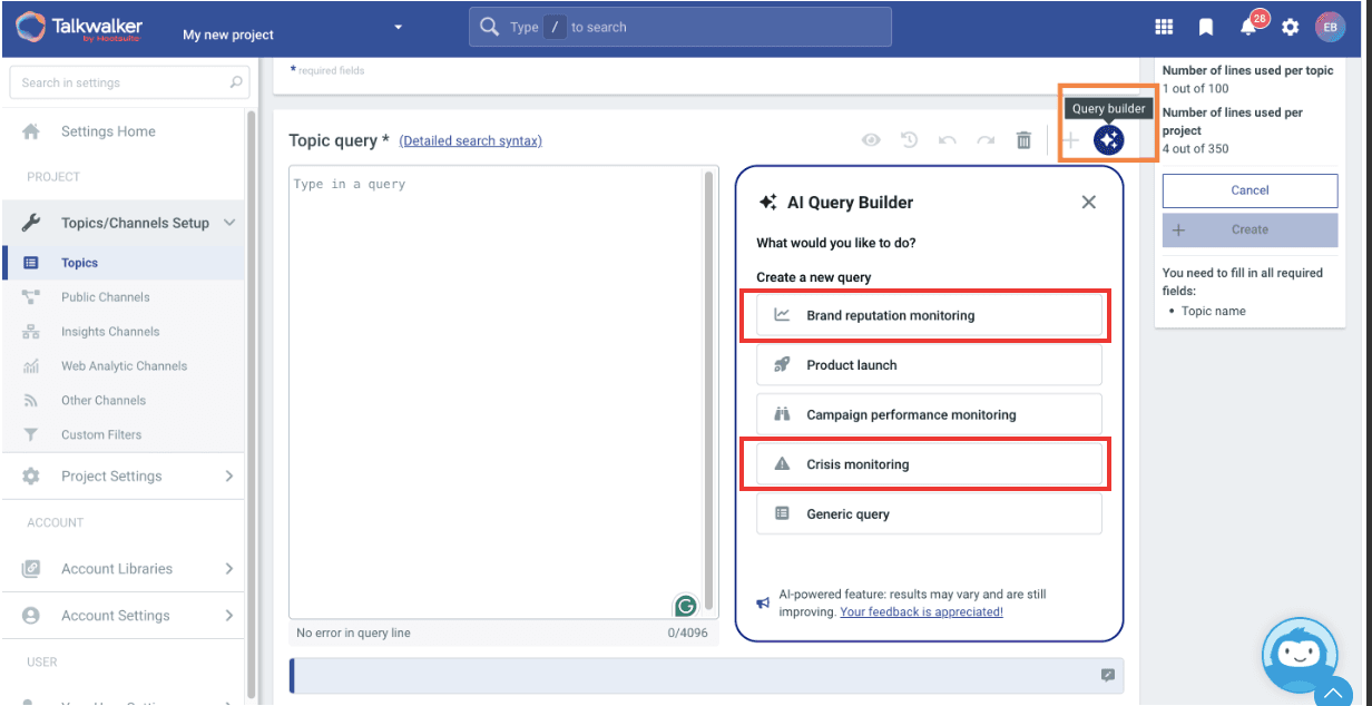 In both cases, you just enter the brand name and describe what you want to monitor, and the AI Query Builder will create a search for you that you can monitor in real time.