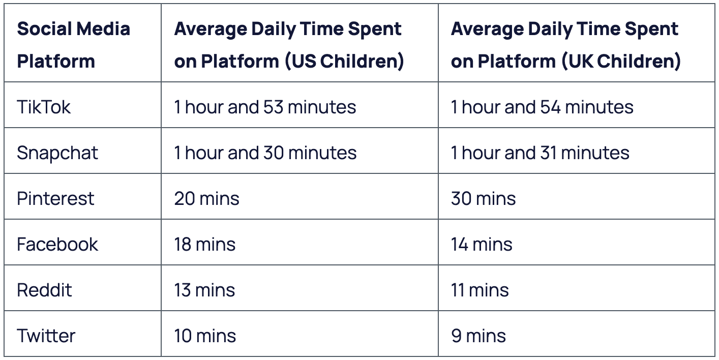 38. Platform usage is particularly high among children in the United Kingdom, who spend an average of 1 hour 54 minutes daily on TikTok, making it their #1 most-used platform.