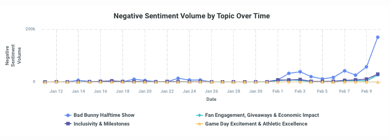 The Bad Bunny halftime show accounted for the highest volume of negative sentiment by a wide margin, peaking at 170,027 negative mentions on February 10, 2026. Smaller but consistent spikes occurred on February 2 (32,356), February 3 (38,514), February 7 (42,103), and February 9 (57,189), indicating sustained debate rather than a single-day reaction.