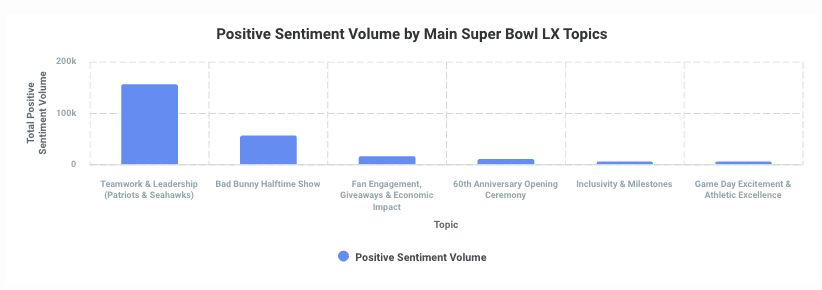 The single largest driver of positive sentiment was Teamwork & Leadership (Patriots & Seahawks), generating 156,301 positive mentions. This far exceeded all other tracked topics, including the halftime show.