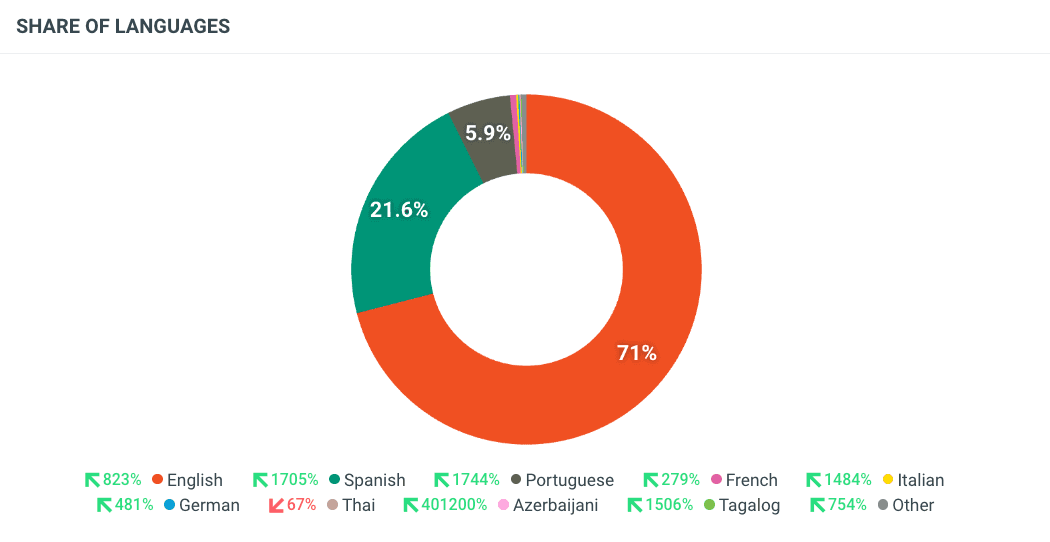 Spanish-language sentiment showed strong positive engagement (15,000 mentions) alongside higher negative sentiment (7,000) than English, indicating more polarized discussion within this group. English-language conversation remained larger overall, with comparatively lower negative volume (5,000).