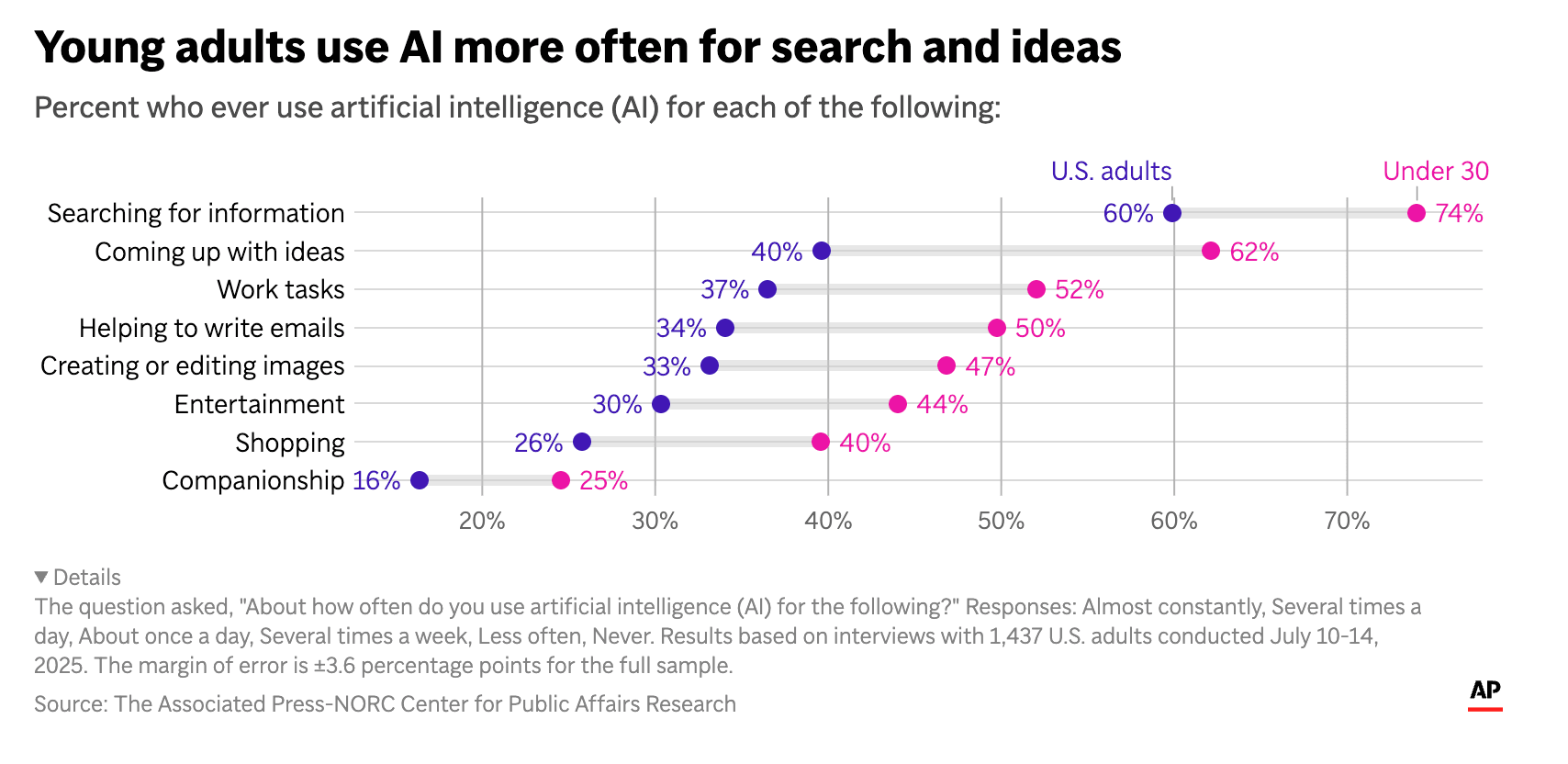 Separate polling from Associated Press-NORC Center for Public Affairs Research found that 60% of U.S. adults already use AI tools to search for information, with adoption even higher among younger audiences.