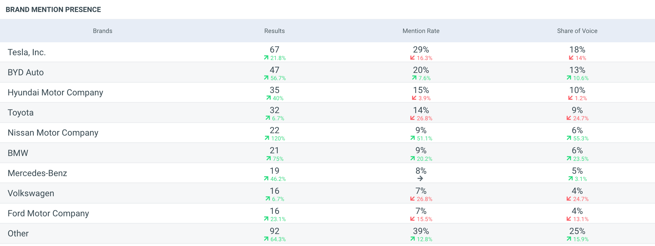 Brand mention presence shows how often each tracked brand appears in AI responses. It includes the number of results, mention rate, and share of voice, giving a quick view of which brands appear most frequently in AI-generated answers.