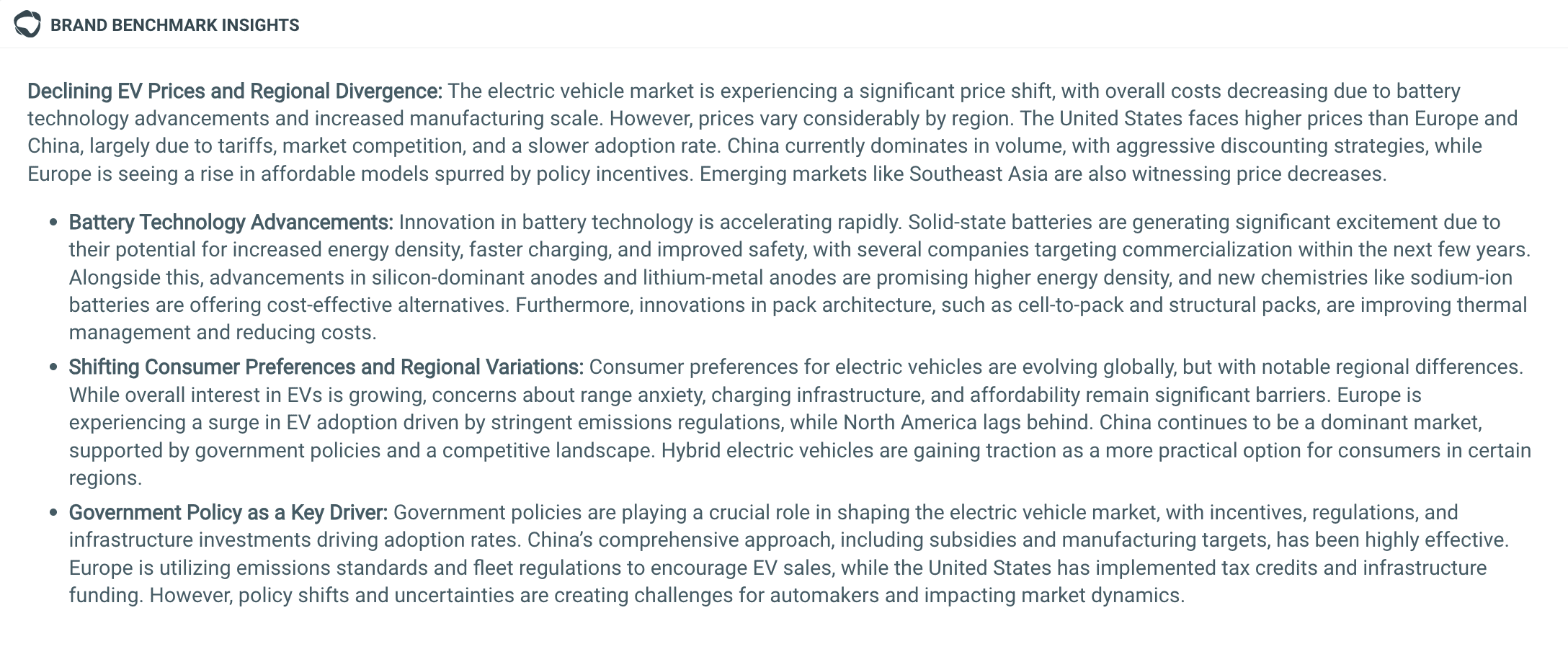Brand benchmark insights summarizes the main themes AI models associate with your brand and category. It highlights recurring narratives in AI search results, such as consumer trends, product positioning, or public perception. Think of it like a simple snapshot of your overall LLM brand visibility.