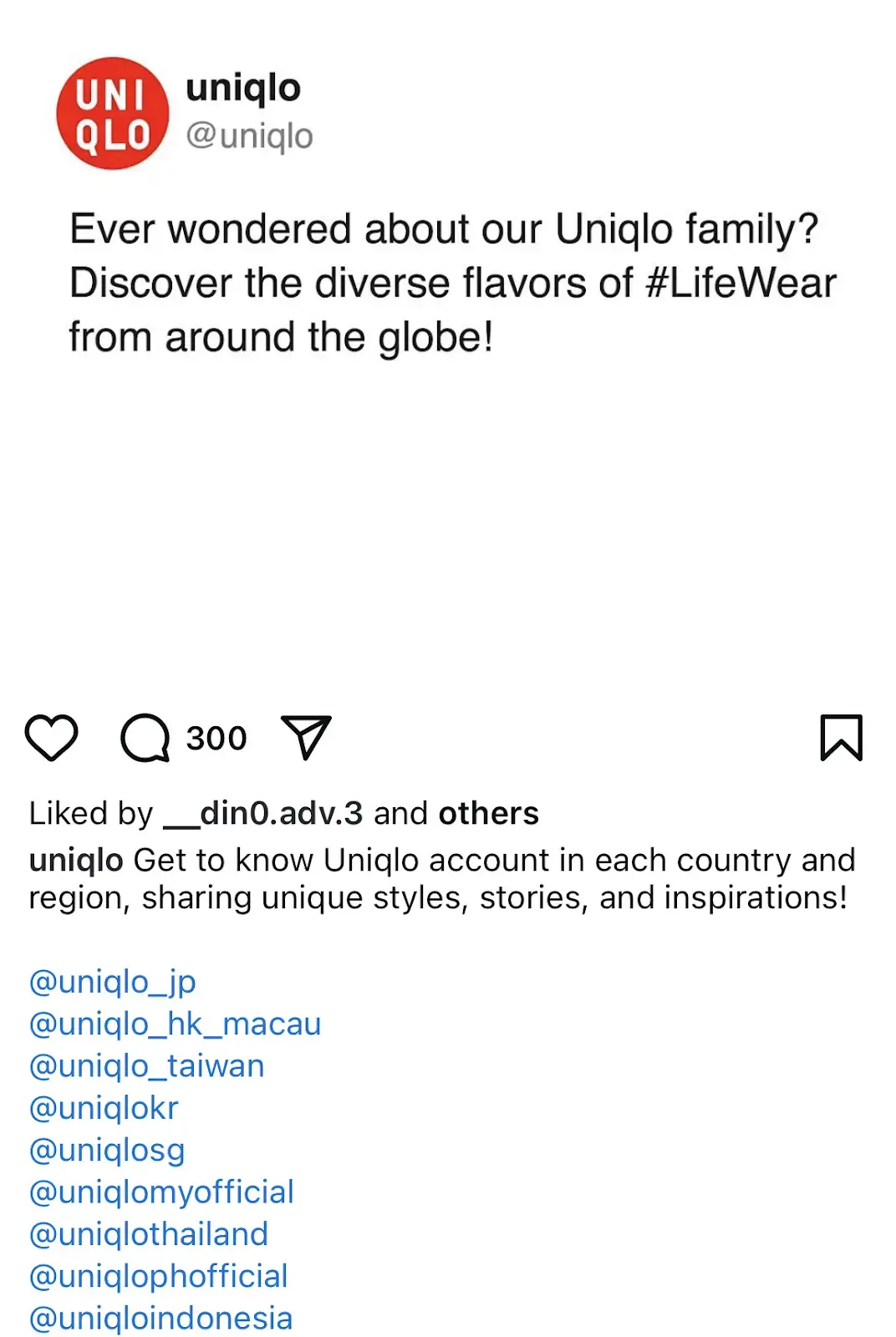 From @uniqlo_jp to @uniqloindonesia, each account speaks to its local audience.