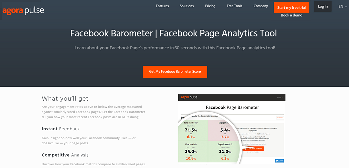 AgoraPulse bietet spezialisiertere Facebook-Analysefunktionen. Mit einem Tool können Sie Ihre Seite benchmarken und die Performance Ihrer Inhalte ermitteln. Sie können sich den Top-Content anzeigen lassen und sehen, welche Metriken verbessert werden müssen. Außerdem können Sie Quizze oder Gewinnspiele auf Ihrer Seite durchführen.