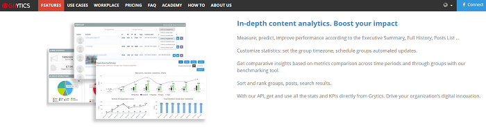 Wenn Ihre lautesten Follower Mitglieder mehrerer Facebook-Gruppen sind, kann Grytics sie zusammenbringen. Es handelt sich um eine SaaS-Lösung für Community-Manager, mit deren Hilfe die Leistung von Gruppen getrackt und analysiert werden kann. Außerdem werden die Statistiken der Mitglieder angezeigt, damit Sie Ihre Zielgruppe besser verstehen können.