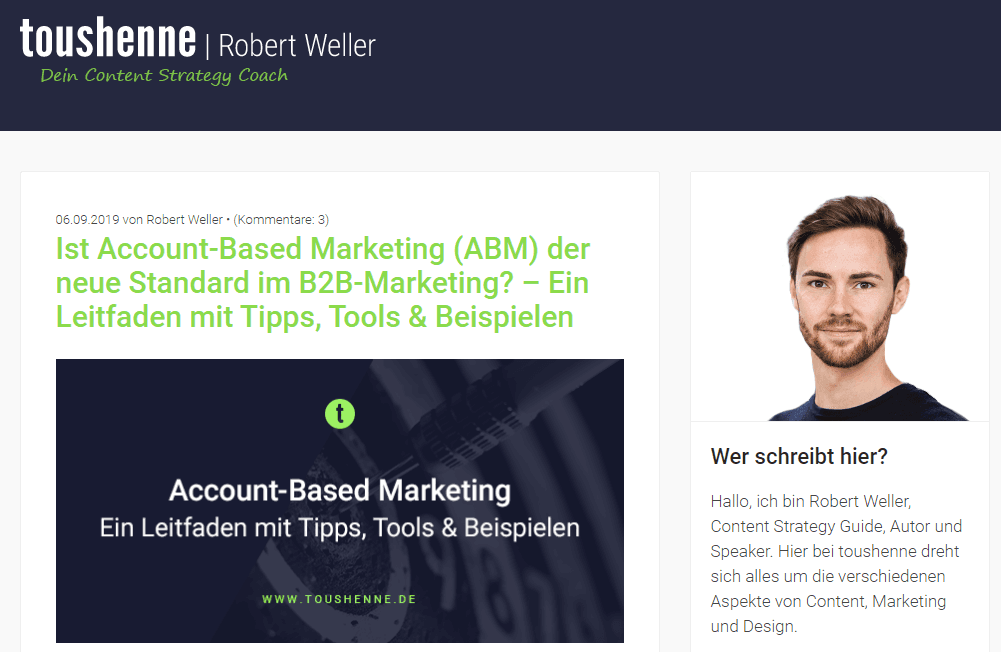 Robert Weller | Zu Content Marketing findet man online viele Experten. Keiner geht jedoch an dieses Thema so analytisch ran wie Robert Weller in seinem Blog Toushenne, und nennt sich daher zurecht Content Strategy Coach. Social Listening ist für ihn zwingende Grundlage für gutes Content Marketing (Artikel hier). Er beschäftigt sich aber auch mit neuen Tendenzen wie Agiles Content Marketing (Artikel hier). Robert ist außerdem seit kurzem Director Growth Academy konversionsKRAFT.