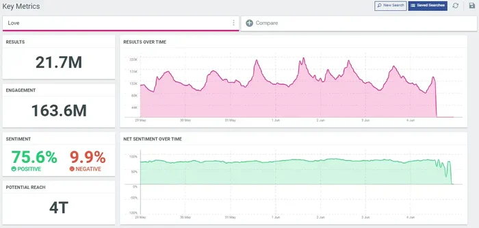 Encuentra el número de resultados, los niveles de engagement, el sentimiento y el alcance potencial de los temas.